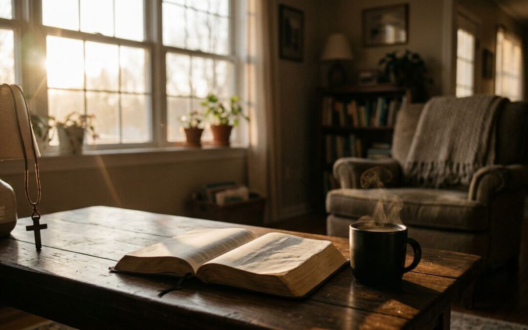A middle-aged person reads an open Bible at a simple wooden kitchen table bathed in warm morning light, with a coffee mug nearby and a garden visible through the window. Cinematic style with strong contrast, depth, and dramatic shadows.