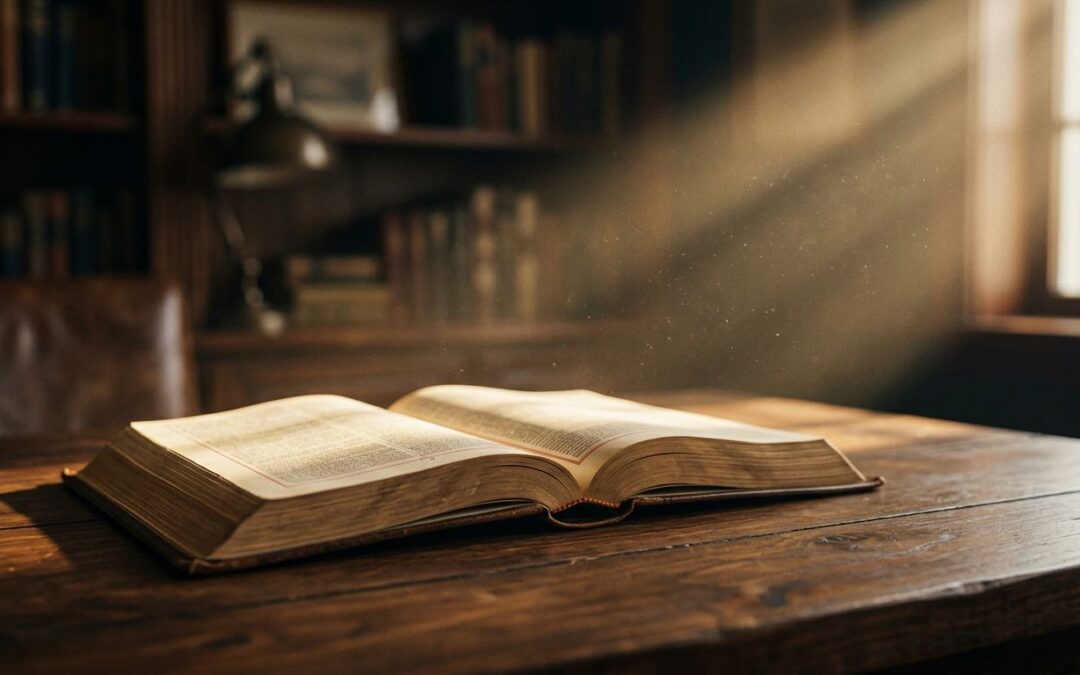 Close-up of an open Bible on a wooden table with notebook, pen, and coffee mug nearby, bathed in soft morning light with cinematic contrast and depth.